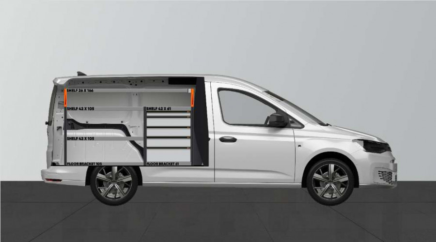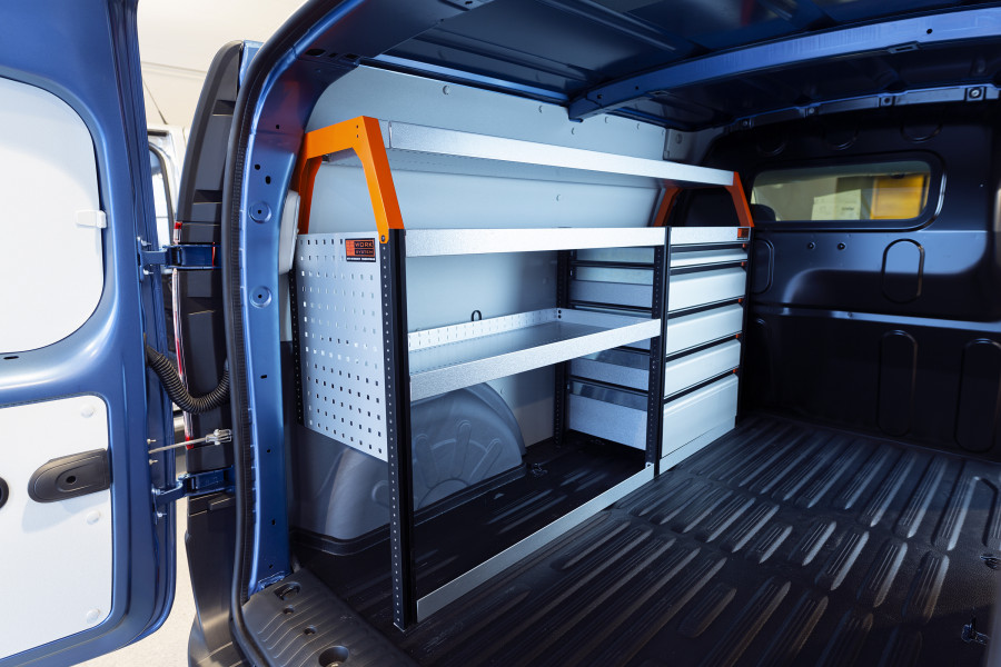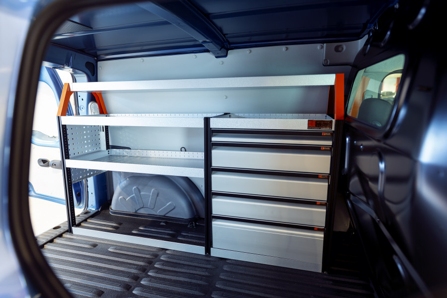 Este es uno de los sistemas más populares para su VW Caddy Cargo & Ford Connect L2. El equipamiento ofrece unas buenas posibilidades de almacenamiento tanto para maletines de herramientas y máquinas como para las piezas más pequeñas. Dispondrá de una cajonera con 5 uds. con cajones de distintos tamaños para tener todo en su sitio y ordenado. Los cajones van sobre guías y rodamientos de precisión completandose a menudo con nuestros nuevos accesorios de quita y pon para cajones y separadores, esto le permiten crear la mejor combinación posible. Una alternativa popular para maximizar el espacio de almacenamiento es completar también los laterales con portaherramientas y nuestras soportes compactos.