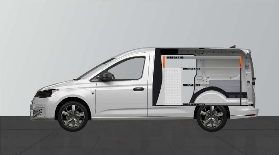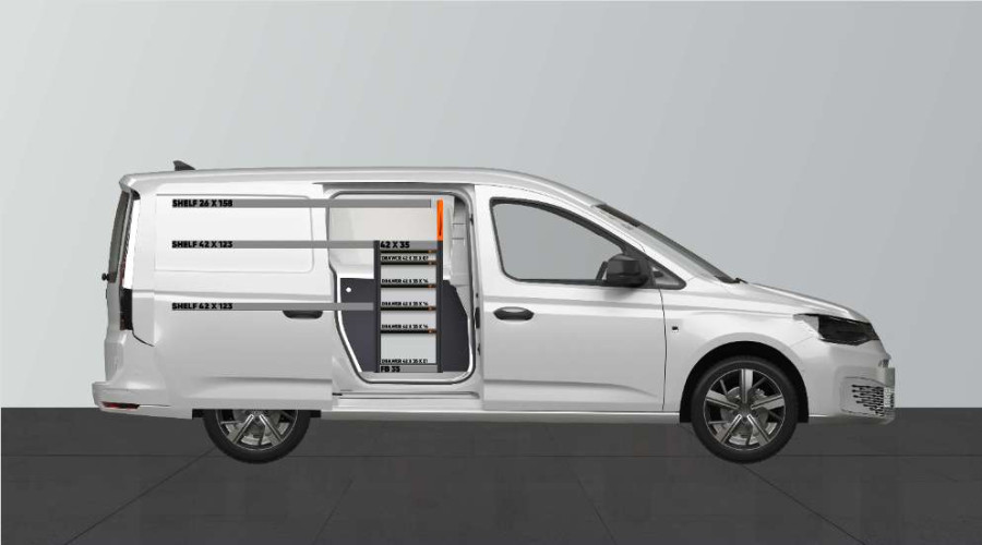 Este es uno de los sistemas más populares para su VW Caddy Cargo & Ford Connect L2 con puertas laterales en el lado del equipamiento. El equipamiento ofrece unas buenas posibilidades de almacenamiento tanto para maletines de herramientas y máquinas como para las piezas más pequeñas. Dispondrá de una cajonera con 5 uds. con cajones de distintos tamaños para tener todo en su sitio y ordenado. Detrás de los cajones hay un panel de herramientas que le ofrece posibilidades adicionales para colgar objetos en el vehículo. Los cajones van sobre guías con rodamientos y se completan a menudo con nuestros nuevos utensilios de quita y pon para cajones y separadores, esto le permite crear la mejor estructura posible. Una alternativa popular para maximizar el espacio de almacenamiento, completando los laterales portaherramientas con nuestros accesorios porta objetos.