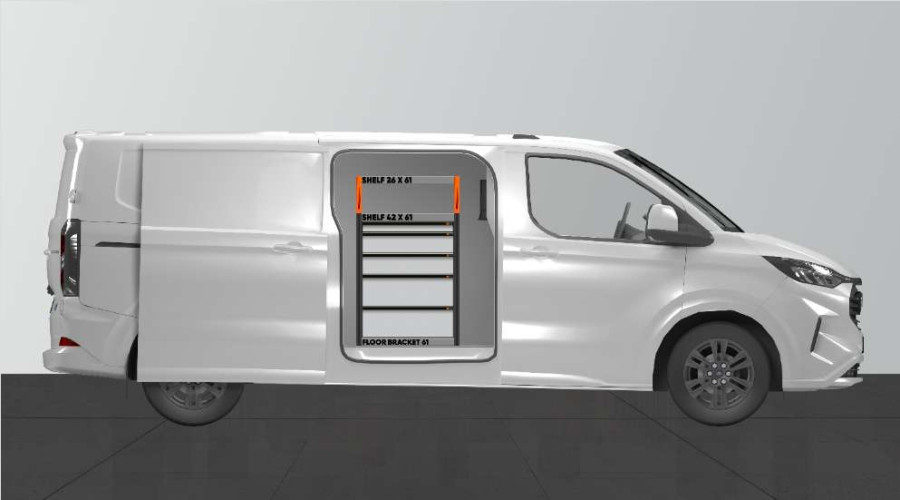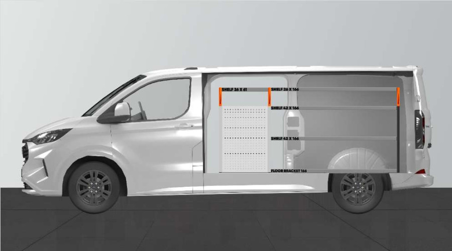 Este es uno de los sistemas más populares para su Ford Custom & VW Transporter L2 con puertas laterales en el lado del equipamiento. El equipamiento ofrece unas buenas posibilidades de almacenamiento tanto para maletines de herramientas y máquinas como para las piezas más pequeñas. Dispondrá de una cajonera con 5 uds. con cajones de distintos tamaños para tener todo en su sitio y ordenado. Detrás de los cajones hay un panel de herramientas que le ofrece posibilidades adicionales para colgar objetos en el vehículo. Los cajones van sobre guías con rodamientos y se completan a menudo con nuestros nuevos utensilios de quita y pon para cajones y separadores, esto le permite crear la mejor estructura posible. Una alternativa popular para maximizar el espacio de almacenamiento, completando los laterales portaherramientas con nuestros accesorios porta objetos.