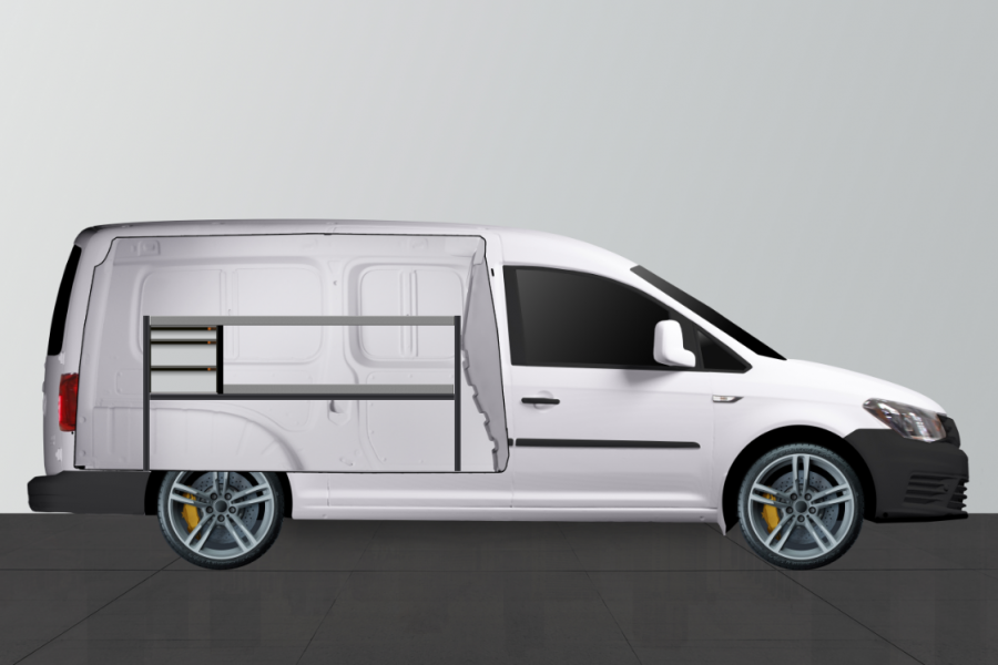 Una alternativa asequible para aquellas personas que desean tener una combinación de cajones sobre carriles con rodamientos de bolas pero también muchas alternativas de almacenamiento en forma de estanterías para su VW Caddy Maxi. El equipamiento tiene un fondo de 420 mm, lo que permite almacenar a la perfección en las estanterías la mayoría de los maletines de herramientas del mercado. Una opción popular es completar los cajones con nuestros nuevos cajones para objetos variados. Esto le ofrece buenas posibilidades para mantener todas las piezas pequeñas pulcramente ordenadas.