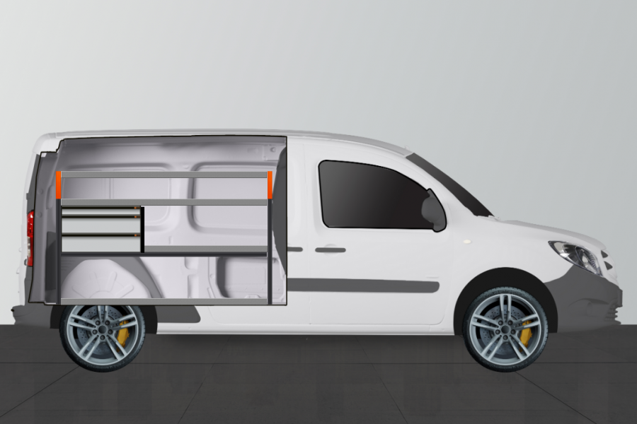 Este es uno de nuestros equipamientos para vehículos más populares para furgonetas Mercedes Citan Extralarga, Nissan NV250 L2 y Renault Kangoo Maxi. Conseguirá unas buenas posibilidades de almacenamiento para sus maletines de herramientas, máquinas, consumibles y todo el resto de piezas pequeñas. Y a los mejores precios del mercado. Una opción popular es completar los cajones con nuestros nuevos cajones para objetos variados. Una alternativa popular para maximizar el espacio de almacenamiento es completar los laterales portaherramientas con nuestras cajas inteligentes. El peso de carga dividido entre los cajones sobre carriles con rodamientos de bolas es de 35 kg/ud. Las medidas internas (en mm) de los cajones son: 579 de ancho, 387 de profundidad y 60 y 130 de alto.