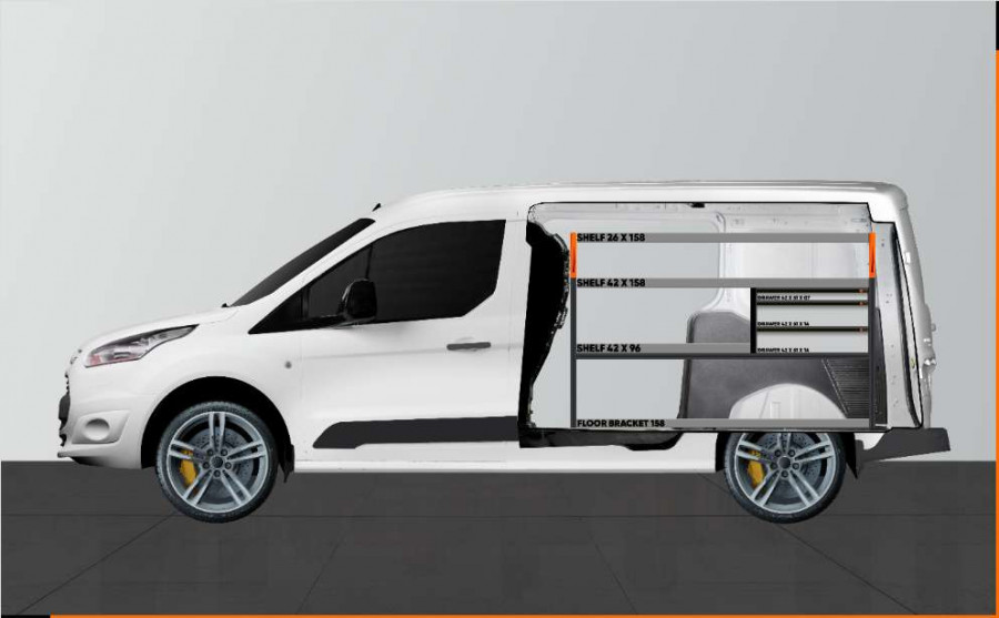 Este es uno de nuestros equipamientos más habituales para su Ford Connect L2. El equipamiento LS3 lo utilizan tanto técnicos de mantenimiento de edificios como técnicos de servicio, electricistas, fontaneros y carpinteros. El equipamiento ofrece unas óptimas posibilidades de almacenamiento tanto para maletines de herramientas, máquinas y consumibles como para las piezas más pequeñas. Los cajones se complementan a menudo con nuestros utensilios de quita y pon para cajones y separadores, también los laterales designados como portaherramientas se suelen completar con nuestras accesorios compactos para maximizar el espacio de almacenamiento.