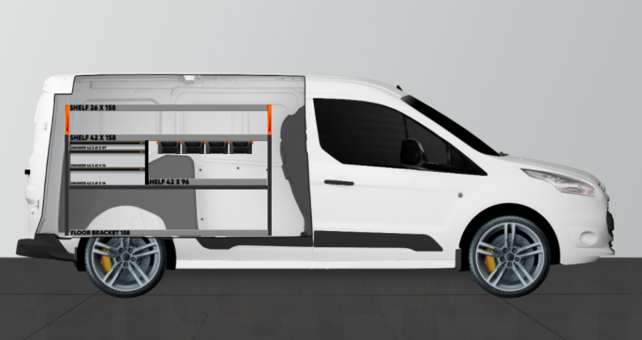 Este es uno de nuestros equipamientos para vehículos más populares para la Ford Connect L2H1. Conseguirá unas buenas posibilidades de almacenamiento para sus maletines de herramientas, máquinas, consumibles y todo el resto de piezas pequeñas. En este equipamiento se incluyen 4 de nuestras nuevas bandejas modulares inteligentes sobre carriles. Y todo al mejor precio del mercado. Una opción popular es completar los cajones sobre carriles con rodamientos de bolas con nuestros nuevos cajones para objetos variados. Una alternativa popular para maximizar el espacio de almacenamiento es completar los laterales portaherramientas con nuestras cajas inteligentes. El peso de carga dividido entre los cajones sobre carriles con rodamientos de bolas es de 35 kg/ud. Las medidas internas (en mm) de los cajones son: 579 de ancho, 387 de profundidad y 61 y 131 de alto.