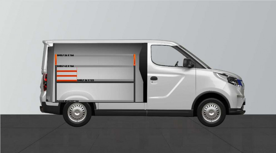 Un equipamiento habitual para personas que necesitan unas óptimas posibilidades de almacenamiento de objetos y equipos pequeños, así como para maletines de herramientas y máquinas. Este equipamiento de servicio contiene 3 soportes para objetos que se adaptan al cajón para objetos, es el más popular del mercado, Racco Carrylight. Si lo desea, el equipamiento se puede completar con estos cajones para objetos diversos. Este equipamiento para vehículos es perfecto para su Maxus e-Deliver 3 L1.