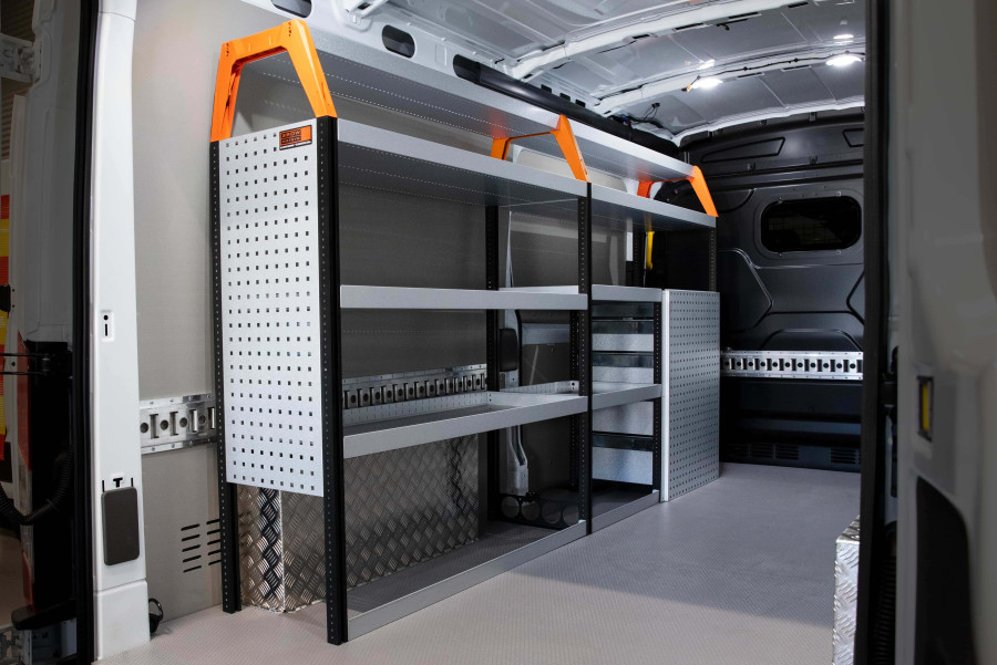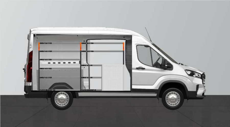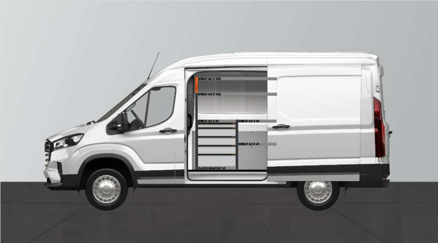 Este es uno de los sistemas más populares para su Maxus e-Deliver 9 L2 con puertas laterales en el lado del equipamiento. El equipamiento ofrece unas buenas posibilidades de almacenamiento tanto para maletines de herramientas y máquinas como para las piezas más pequeñas. Dispondrá de una cajonera con 5 uds. con cajones de distintos tamaños para tener todo en su sitio y ordenado. Detrás de los cajones hay un panel de herramientas que le ofrece posibilidades adicionales para colgar objetos en el vehículo. Los cajones van sobre guías con rodamientos y se completan a menudo con nuestros nuevos utensilios de quita y pon para cajones y separadores, esto le permite crear la mejor estructura posible. Una alternativa popular para maximizar el espacio de almacenamiento, completando los laterales portaherramientas con nuestros accesorios porta objetos.