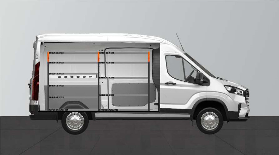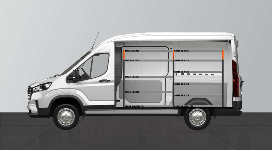 Una equipo adaptado a su Maxus e-Deliver9 L2, ofreciéndole muy buenas opciones de almacenamiento tanto para maletines de herramientas y máquinas como para las piezas más pequeñas. Las estanterías del equipamiento tienen un fondo de 420 mm, permitiendo guardar fácilmente la mayoría de los maletines de herramientas del mercado. La estantería superior, es de 262,5 mm completándose a menudo con nuestras bandejas modulares. De este modo, es posible disponer de espacio para guardar todas las piezas más pequeñas. Sin olvidarnos de utilizar el panel para herramientas ubicado en lateral designado como portaherramientas.