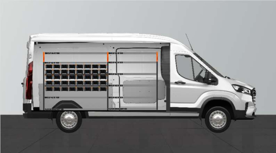 RACK es un nuevo equipamiento para vehículos líder en el sector para el Maxus e-Deliver9 L3. Es perfecto para aquellas personas que necesitan óptimas posibilidades de almacenamiento para todo tipo de objetos tales como tornillos, acoplamientos, pernos, brocas, etc. El equipamiento está maximizado con un total de 40 de nuestras nuevas bandejas modulares, que se pueden dividir. Las bandejas modulares se extraen sobre carriles fijos, lo cual ofrece un acceso flexible. El frente de las bandejas modulares se ha diseñado para ofrecer una accesibilidad óptima pudiéndose completar con un frontal transparente y divisiones transversales que se pueden colocar cada 60 mm.