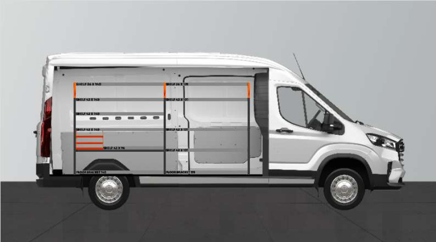 Un equipamiento habitual para personas que necesitan unas óptimas posibilidades de almacenamiento de objetos y equipos pequeños, así como para maletines de herramientas y máquinas. Este equipamiento de servicio contiene 3 soportes para objetos que se adaptan al cajón para objetos, es el más popular del mercado, Racco Carrylight. Si lo desea, el equipamiento se puede completar con estos cajones para objetos diversos. Este equipamiento para vehículos es perfecto para su Maxus e-Deliver 9 L3.