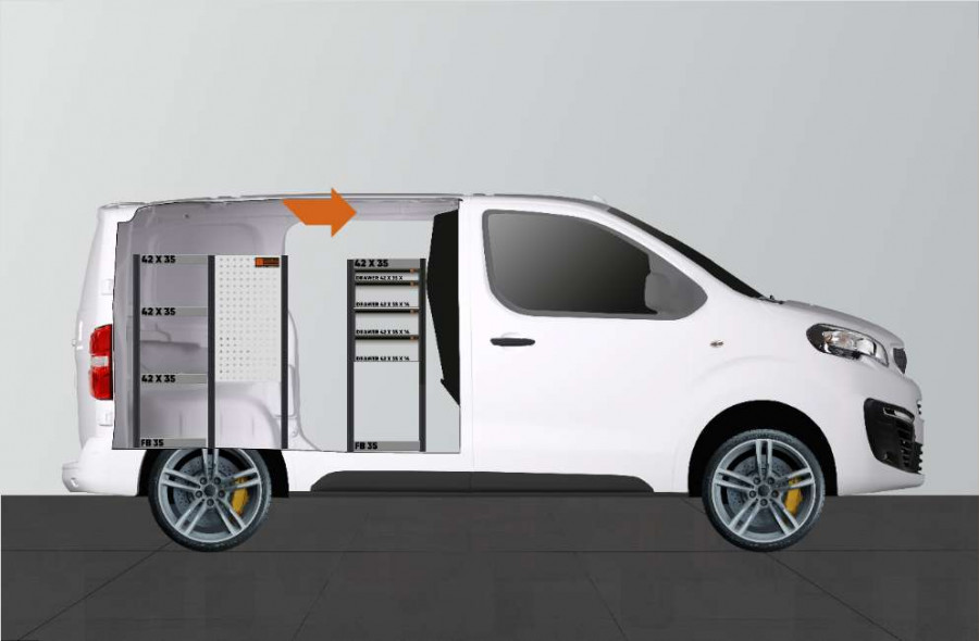 El conjunto de estantes para furgonetas más vendido para su Peugeot Expert, Citroen Jumpy, Opel Vivaro, Fiat Scudo & Toyota ProAce L1. El equipamiento ofrece múltiples posibilidades de almacenamiento, ya que los cajones sobre las guías con rodamientos de precisión permiten un acceso flexible a través de la puerta lateral, además de que los cajones se pueden sacar en la dirección de la marcha para tener una buena visión general. Se puede completar con los separadores de cajones maximizando la estructura entre las piezas más pequeñas. Nuestras estanterías más profundas ofrecen también óptimas posibilidades de almacenamiento para maletines de herramientas y máquinas de menor tamaño. La capacidad de carga de cada cajón sobre guías con rodamientos de precisión es de 35 kg/ud. Las medidas internas (en mm) de los cajones son: 308 de ancho, 384 de profundidad y 61 y 131 de alto.