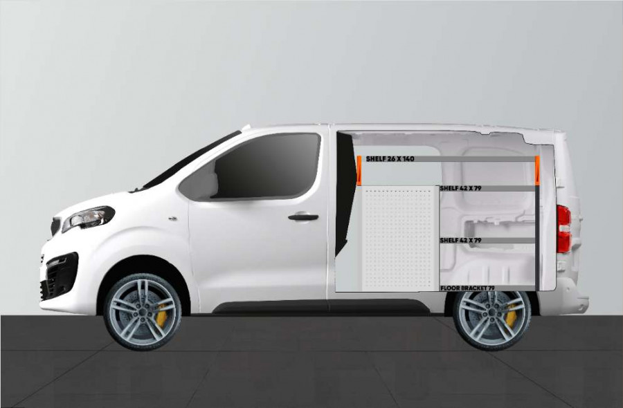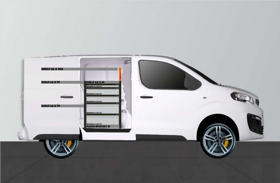 Este es uno de los sistemas más populares para su Peugeot Expert, Citroen Jumpy, Opel Vivaro, Fiat Scudo & Toyota ProAce. El equipamiento ofrece unas buenas posibilidades de almacenamiento tanto para maletines de herramientas y máquinas como para las piezas más pequeñas. Dispondrá de una cajonera con 5x con cajones de distintos tamaños para tener todo en su sitio y ordenado. Los cajones van sobre guías y rodamientos de precisión completandose a menudo con nuestros nuevos accesorios de quita y pon para cajones y separadores, esto le permiten crear la mejor combinación posible. Una alternativa popular para maximizar el espacio de almacenamiento es completar también los laterales con portaherramientas y nuestras soportes compactos.