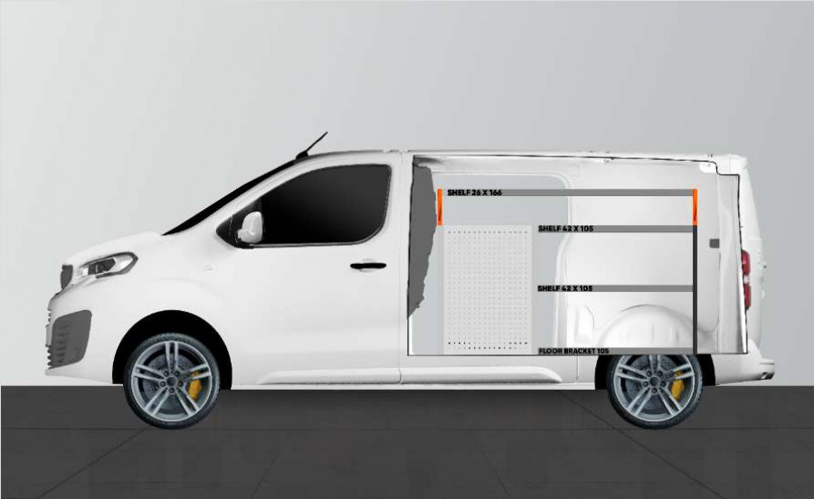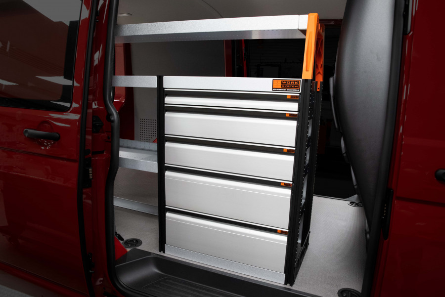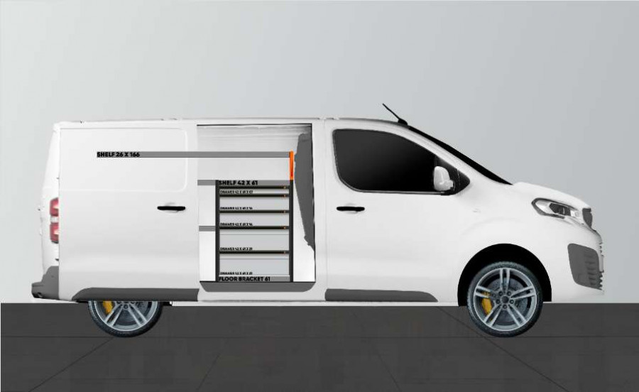 Este es uno de los sistemas más populares para su Peugeot Expert, Citroën Jumpy, Opel Vivaro, Fiat Scudo & Toyota ProAce L2 con puertas laterales en el lado del equipamiento. El equipamiento ofrece unas buenas posibilidades de almacenamiento tanto para maletines de herramientas y máquinas como para las piezas más pequeñas. Dispondrá de una cajonera con 5 uds. con cajones de distintos tamaños para tener todo en su sitio y ordenado. Detrás de los cajones hay un panel de herramientas que le ofrece posibilidades adicionales para colgar objetos en el vehículo. Los cajones van sobre guías con rodamientos y se completan a menudo con nuestros nuevos utensilios de quita y pon para cajones y separadores, esto le permite crear la mejor estructura posible. Una alternativa popular para maximizar el espacio de almacenamiento, completando los laterales portaherramientas con nuestros accesorios porta objetos.