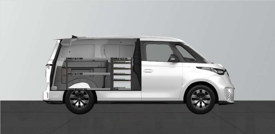 Este es uno de los sistemas más populares para su VOLKSWAGEN ID BUZZ L1. El equipamiento ofrece unas buenas posibilidades de almacenamiento tanto para maletines de herramientas y máquinas como para las piezas más pequeñas. Dispondrá de una cajonera con 5 uds. con cajones de distintos tamaños para tener todo en su sitio y ordenado. Los cajones van sobre guías y rodamientos de precisión completandose a menudo con nuestros nuevos accesorios de quita y pon para cajones y separadores, esto le permiten crear la mejor combinación posible. Una alternativa popular para maximizar el espacio de almacenamiento es completar también los laterales con portaherramientas y nuestras soportes compactos.