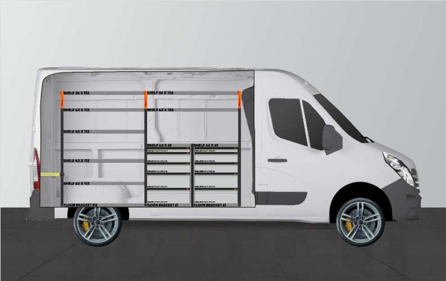 ¿Está buscando un equipamiento que tenga muchos cajones? ¿Son sus requisitos de equipamiento muy exigentes? Si es así, esta es la opción perfecta para usted y para su Opel Movano, Renault Master & Nissan NV400. El equipamiento ofrece unas buenas posibilidades de almacenamiento tanto para maletines de herramientas y máquinas como para las piezas más pequeñas. En total, se incluyen 10 uds. de cajones sobre guías con rodamientos de precisión. Dispondrá también de una cajonera con cajones de distintos tamaños para tener todo en su sitio y ordenado. Una opción habitual es completar los cajones sobre guías con rodamientos de precisión y con nuestros utensilios de quita y pon para cajones y separadores, esto le permitirá crear la mejor combinación posible.