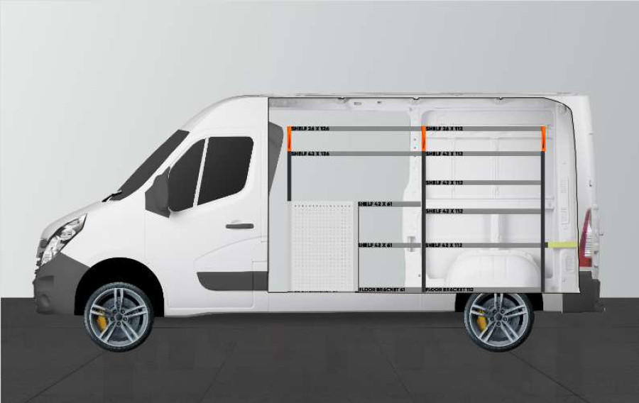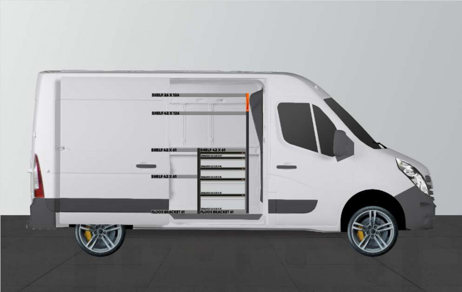 Este es uno de los sistemas más populares para su Opel Movano, Renualt Master & Nissan NV400 con puertas laterales en el lado del equipamiento. El equipamiento ofrece unas buenas posibilidades de almacenamiento tanto para maletines de herramientas y máquinas como para las piezas más pequeñas. Dispondrá de una cajonera con 5 uds. con cajones de distintos tamaños para tener todo en su sitio y ordenado. Detrás de los cajones hay un panel de herramientas que le ofrece posibilidades adicionales para colgar objetos en el vehículo. Los cajones van sobre guías con rodamientos y se completan a menudo con nuestros nuevos utensilios de quita y pon para cajones y separadores, esto le permite crear la mejor estructura posible. Una alternativa popular para maximizar el espacio de almacenamiento, completando los laterales portaherramientas con nuestros accesorios porta objetos.