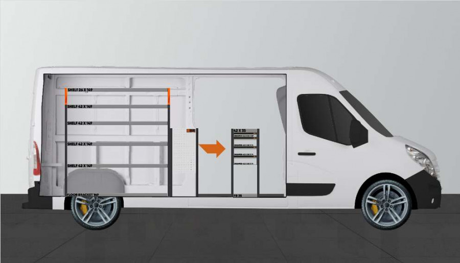 Con una combinación de cajones y estanterías, este equipamiento para vehículos es muy popular, además de ser adecuado para Talento, NV300 & Trafic L2.