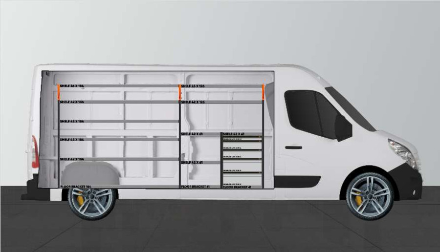Este es uno de los sistemas más populares para su Opel Movano, Renault Master & Nissan NV400 L3. El equipamiento ofrece unas buenas posibilidades de almacenamiento tanto para maletines de herramientas y máquinas como para las piezas más pequeñas. Dispondrá de una cajonera con 5 uds. con cajones de distintos tamaños para tener todo en su sitio y ordenado. Los cajones van sobre guías y rodamientos de precisión completandose a menudo con nuestros nuevos accesorios de quita y pon para cajones y separadores, esto le permiten crear la mejor combinación posible. Una alternativa popular para maximizar el espacio de almacenamiento es completar también los laterales con portaherramientas y nuestras soportes compactos.