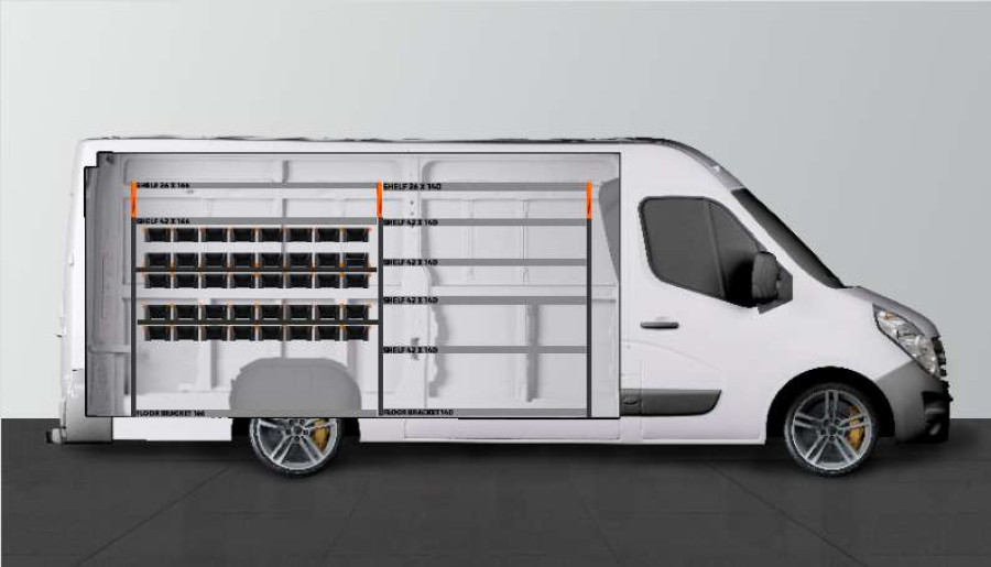 RACK es un nuevo equipamiento para vehículos líder en el sector para el Opel Movano, Renault Master & Nissan NV400 L3. Es perfecto para aquellas personas que necesitan óptimas posibilidades de almacenamiento para todo tipo de objetos tales como tornillos, acoplamientos, pernos, brocas, etc. El equipamiento está maximizado con un total de 40 de nuestras nuevas bandejas modulares, que se pueden dividir. Las bandejas modulares se extraen sobre carriles fijos, lo cual ofrece un acceso flexible. El frente de las bandejas modulares se ha diseñado para ofrecer una accesibilidad óptima pudiéndose completar con un frontal transparente y divisiones transversales que se pueden colocar cada 60 mm.