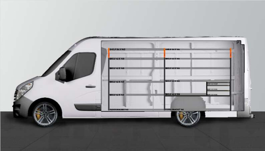 Este es uno de nuestros equipamientos más habituales para su Opel Movano, Renault Master & Nissan NV400 L3. El equipamiento LS3 lo utilizan tanto técnicos de mantenimiento de edificios como técnicos de servicio, electricistas, fontaneros y carpinteros. El equipamiento ofrece unas óptimas posibilidades de almacenamiento tanto para maletines de herramientas, máquinas y consumibles como para las piezas más pequeñas. Los cajones se complementan a menudo con nuestros utensilios de quita y pon para cajones y separadores, también los laterales designados como portaherramientas se suelen completar con nuestras accesorios compactos para maximizar el espacio de almacenamiento.