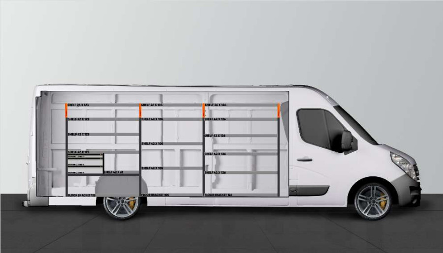 Este es uno de nuestros equipamientos para vehículos más populares para furgonetas Movano, Master y NV400 L4H2. Conseguirá unas buenas posibilidades de almacenamiento para sus maletines de herramientas, máquinas, consumibles y todo el resto de piezas pequeñas. Y a los mejores precios del mercado. Una opción popular es completar los cajones con nuestros nuevos cajones para objetos variados. Una alternativa popular para maximizar el espacio de almacenamiento es completar los laterales portaherramientas con nuestras cajas inteligentes. El peso de carga dividido entre los cajones sobre carriles con rodamientos de bolas es de 35 kg/ud. Las medidas internas (en mm) de los cajones son: 579 de ancho, 387 de profundidad y 60 y 130 de alto.