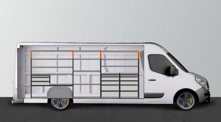 ¿Está buscando un equipamiento que tenga muchos cajones? ¿Tiene además requisitos muy estrictos? Entonces esta es la opción para usted y su Movano, Master o NV400 L4H2. En total, conseguirá 13 cajones sobre carriles con rodamientos de bolas. El equipamiento ofrece buenas posibilidades de almacenamiento para sus maletines de herramientas, máquinas y todo el resto de piezas pequeñas. Conseguirá una cajonera con cajones de distintos tamaños para tener todo en su sitio y ordenado. Una opción popular es completar los cajones sobre carriles con rodamientos de bolas con nuestros nuevos cajones para objetos variados, esto le permite crear la mejor estructura posible. El peso de carga dividido entre los cajones sobre carriles con rodamientos de bolas es de 35 kg/ud. Las medidas internas (en mm) de los cajones son: 579 de ancho, 387 de profundidad y 60, 130 y 200 de alto.