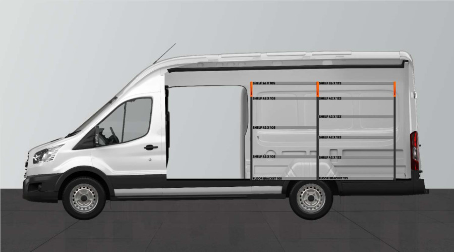 Este equipamiento flexible para su Ford Transit L4H3 ofrece muchas posibilidades de almacenamiento. Complete el equipamiento con los accesorios más adecuados para usted y su trabajo.