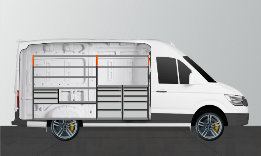 ¿Está buscando un equipamiento que tenga muchos cajones? ¿Tiene además requisitos muy estrictos? Entonces esta es la opción para usted y su Ford Transit L4H3. En total, conseguirá 13 cajones sobre carriles con rodamientos de bolas. El equipamiento ofrece buenas posibilidades de almacenamiento para sus maletines de herramientas, máquinas y todo el resto de piezas pequeñas. Conseguirá una cajonera con cajones de distintos tamaños para tener todo en su sitio y ordenado. Una opción popular es completar los cajones sobre carriles con rodamientos de bolas con nuestros nuevos cajones para objetos variados, esto le permite crear la mejor estructura posible. El peso de carga dividido entre los cajones sobre carriles con rodamientos de bolas es de 35 kg/ud. Las medidas internas (en mm) de los cajones son: 579 de ancho, 387 de profundidad y 60, 130 y 200 de alto.