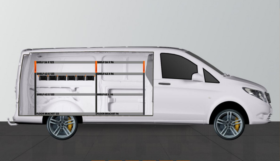 Un equipamiento para vehículos para aquellas personas que, desde el principio, están decididas a mantenerlo todo pulcramente ordenado en su Mercedes Vito Extralarga. En este equipamiento se incluyen 3 de nuestras nuevas bandejas modulares inteligentes. Puede sacarlas sin problemas gracias a nuestros carriles para bandejas modulares. Estos también son fáciles de ajustar y mover a lo largo de las estanterías. Evidentemente, también conseguirá buenas posibilidades de almacenamiento para sus maletines de herramientas, máquinas y material, ya que las estanterías tienen un fondo de 420 mm.